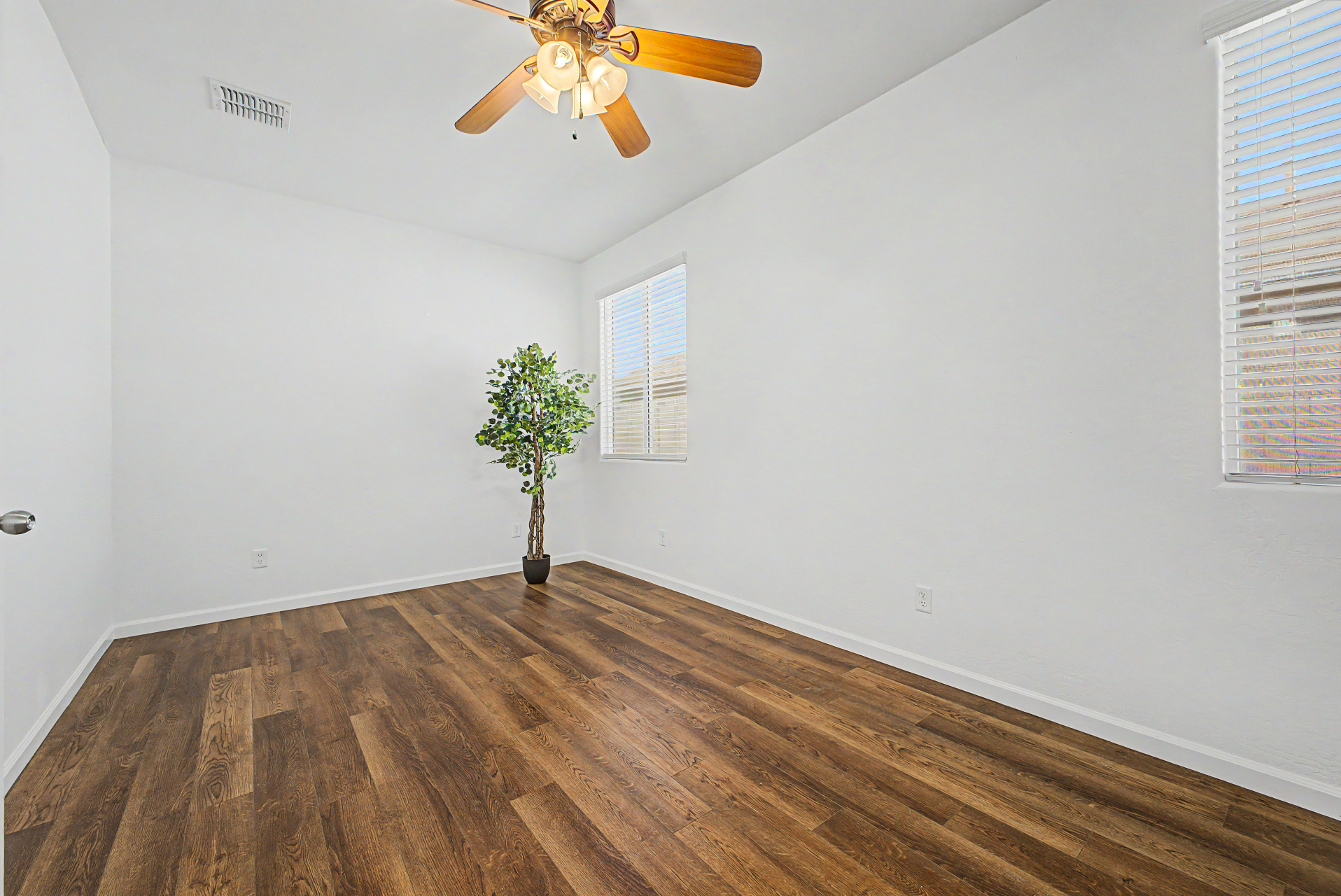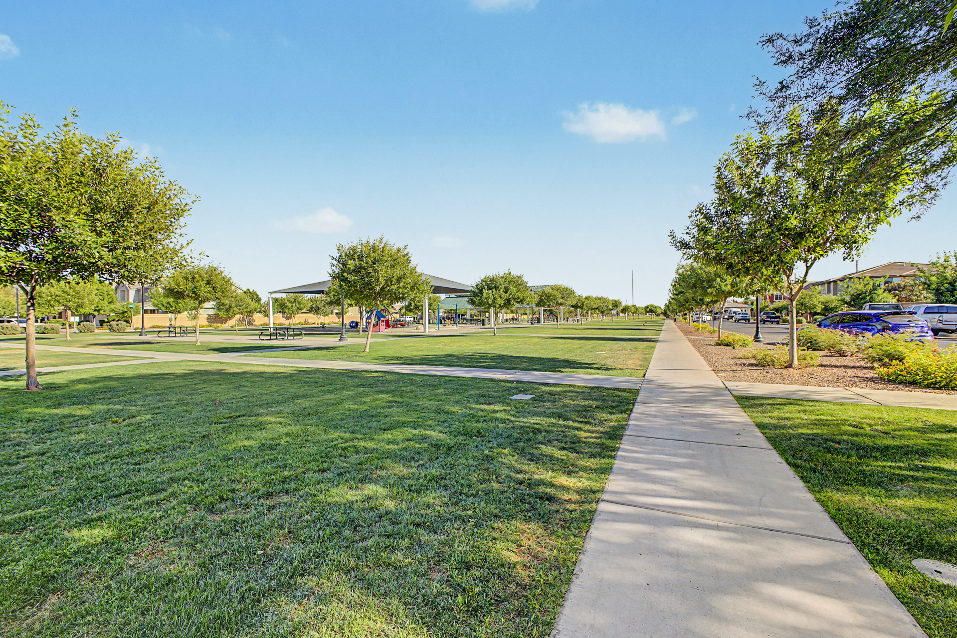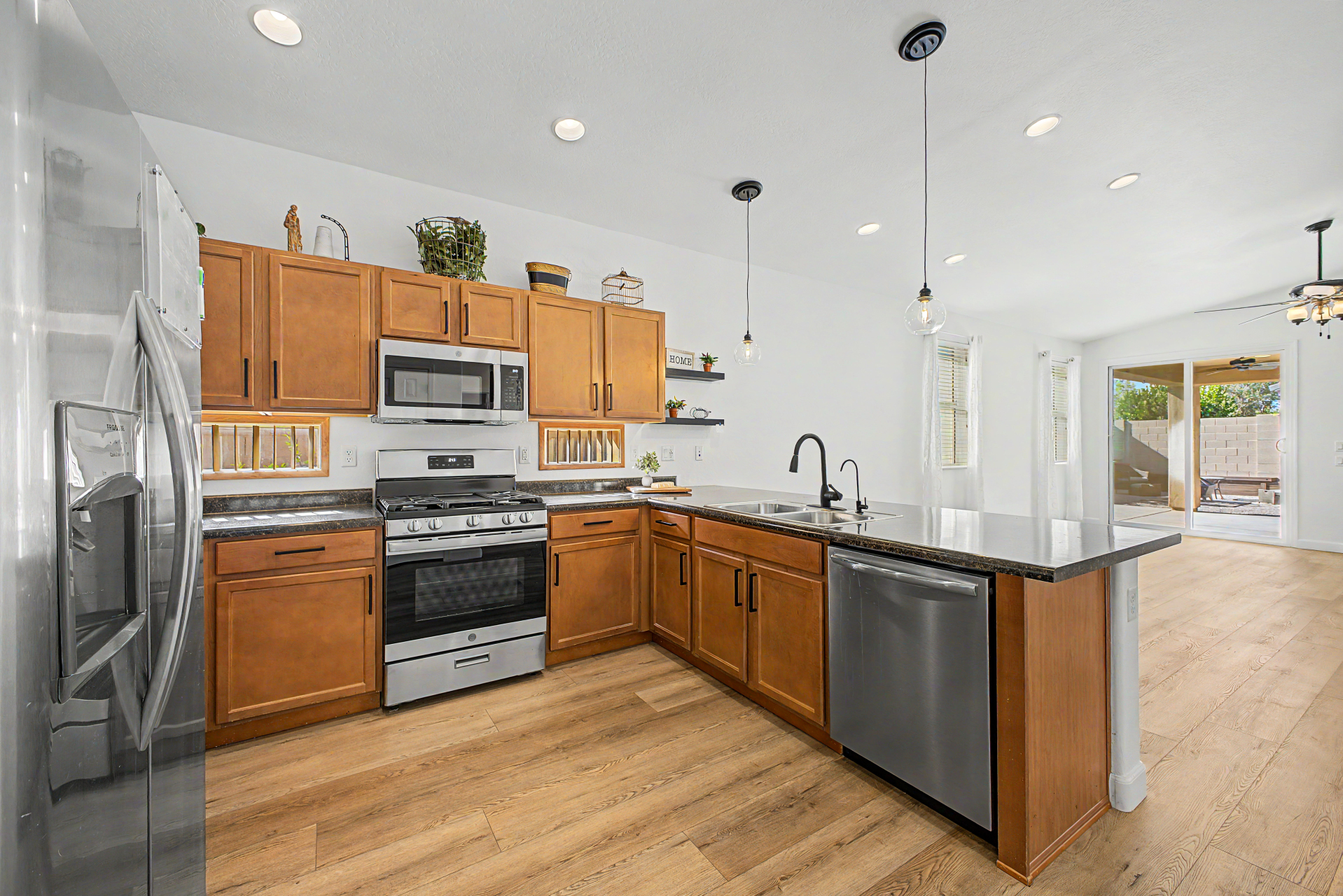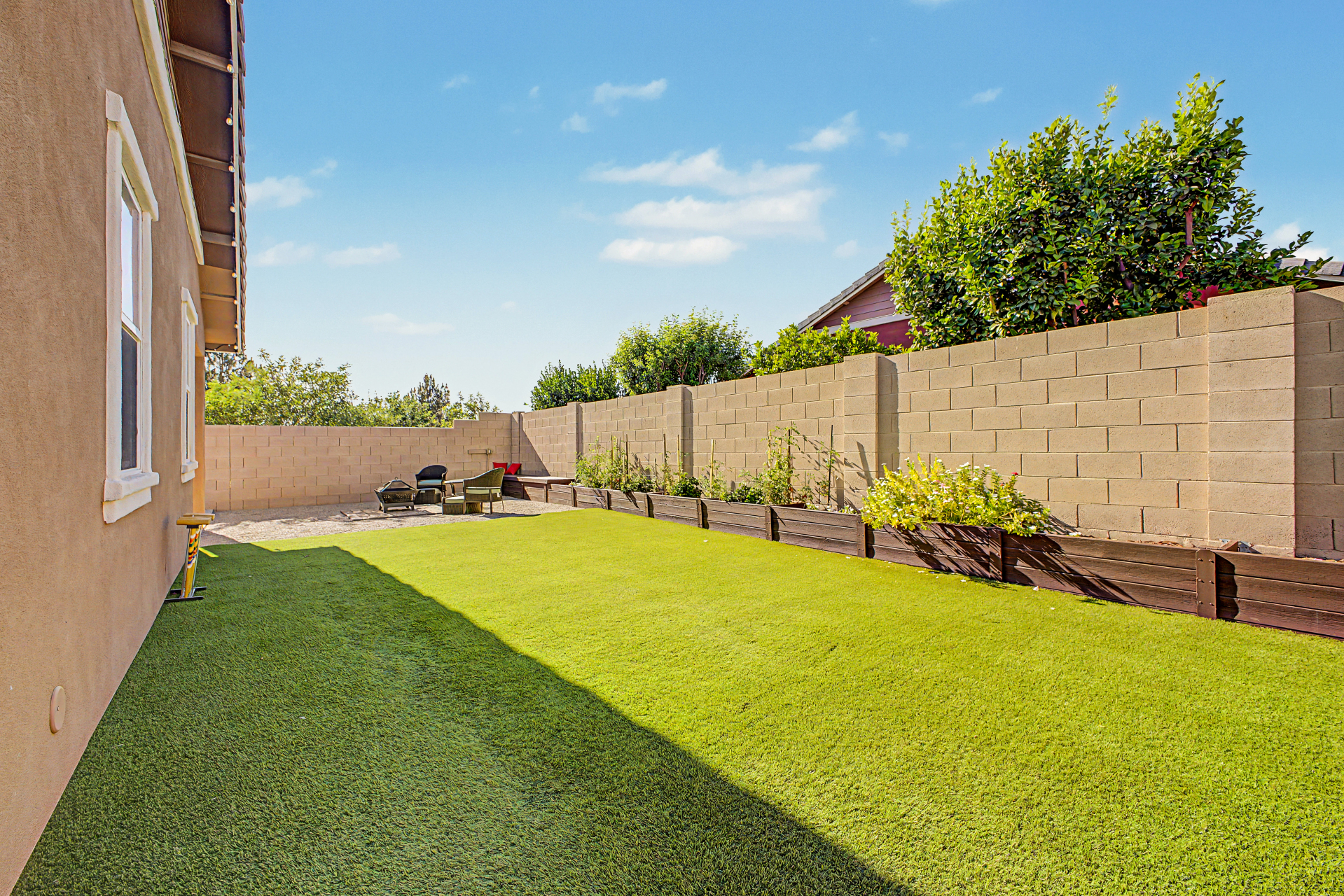 Home, Sweet Home! This beautiful 4 bed, 3 full bath property in Desert Place at Morrison Ranch is Move In Ready! Nestled on a premium corner lot & directly across from Desert Place Park! You'll love the new SS gas range w/5th burner griddle & warming oven, new microwave, new smoke & CO2 detectors, Fresh interior paint, LVP floors installed in 2024, backyard bistro lights, raised planter beds, perfect fire pit w/pavers & rock, EZ care artificial turf & citrus trees! The spacious kitchen has lots of wood cabinets, new hardware, new pull down faucet, filtered water dispenser, plenty of counter space, breakfast bar, large pantry & overlooks the great room! Enjoy your primary retreat with walk-in closet & private exit to the patio! Multiple windows offer natural light to enjoy throughout your