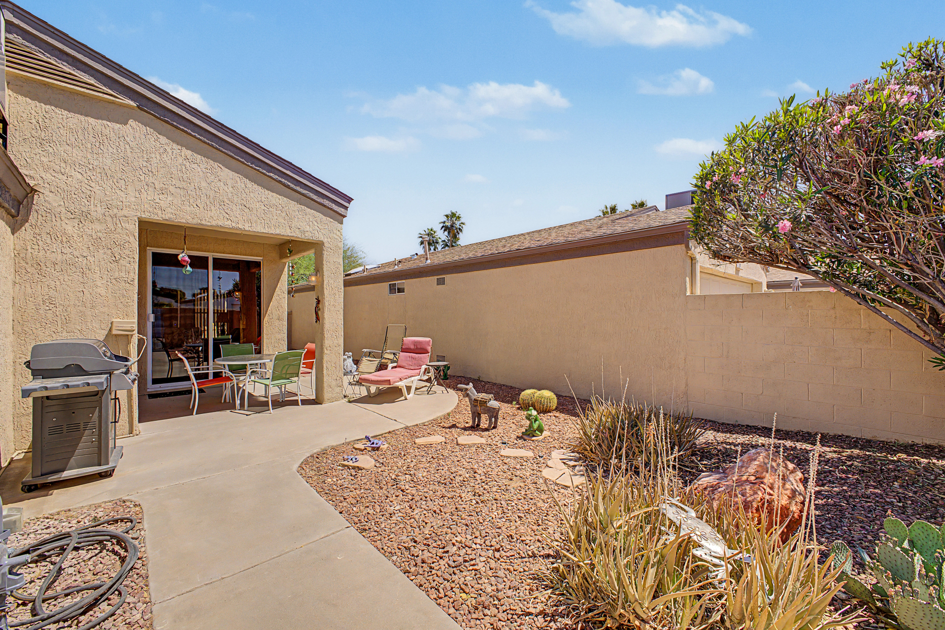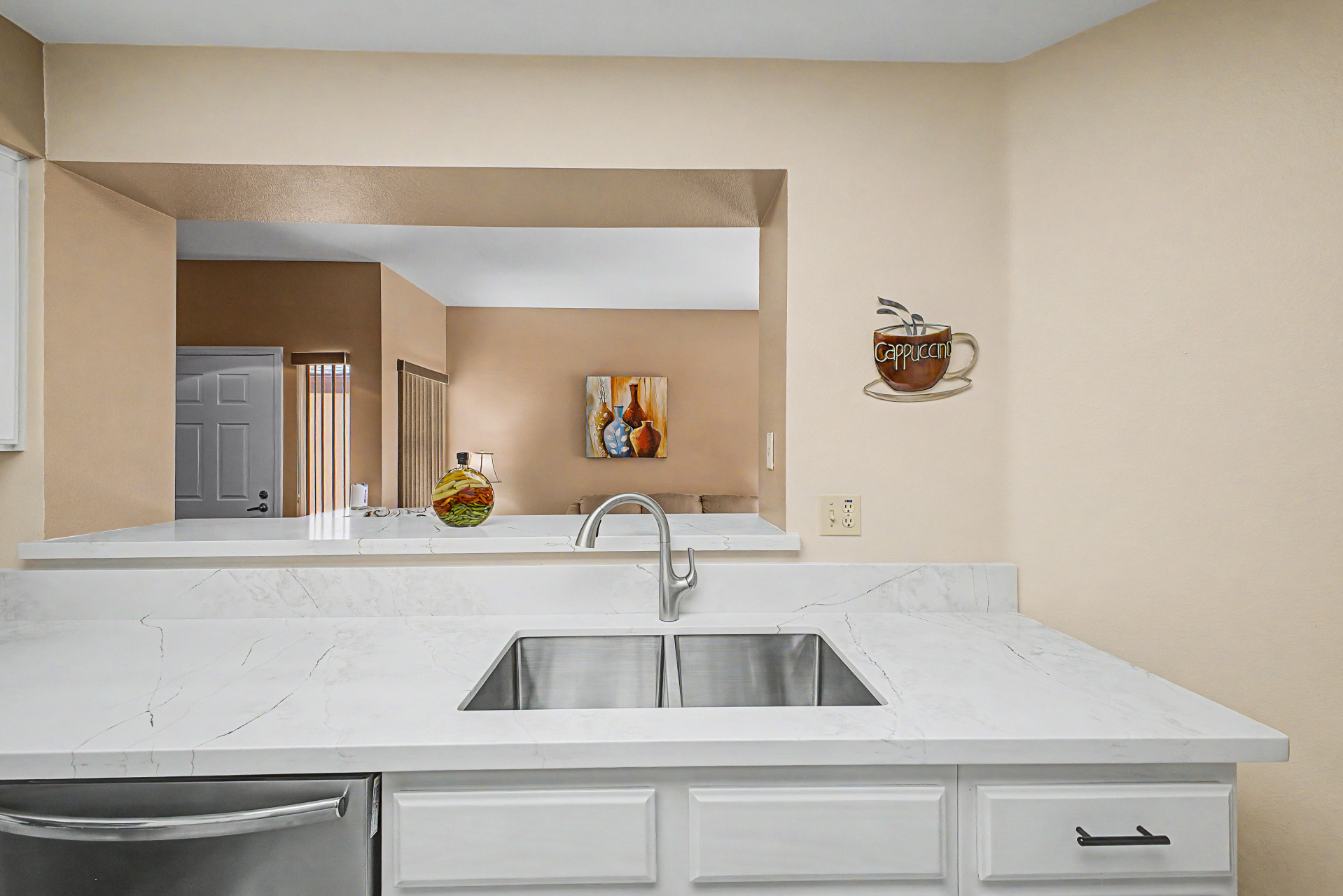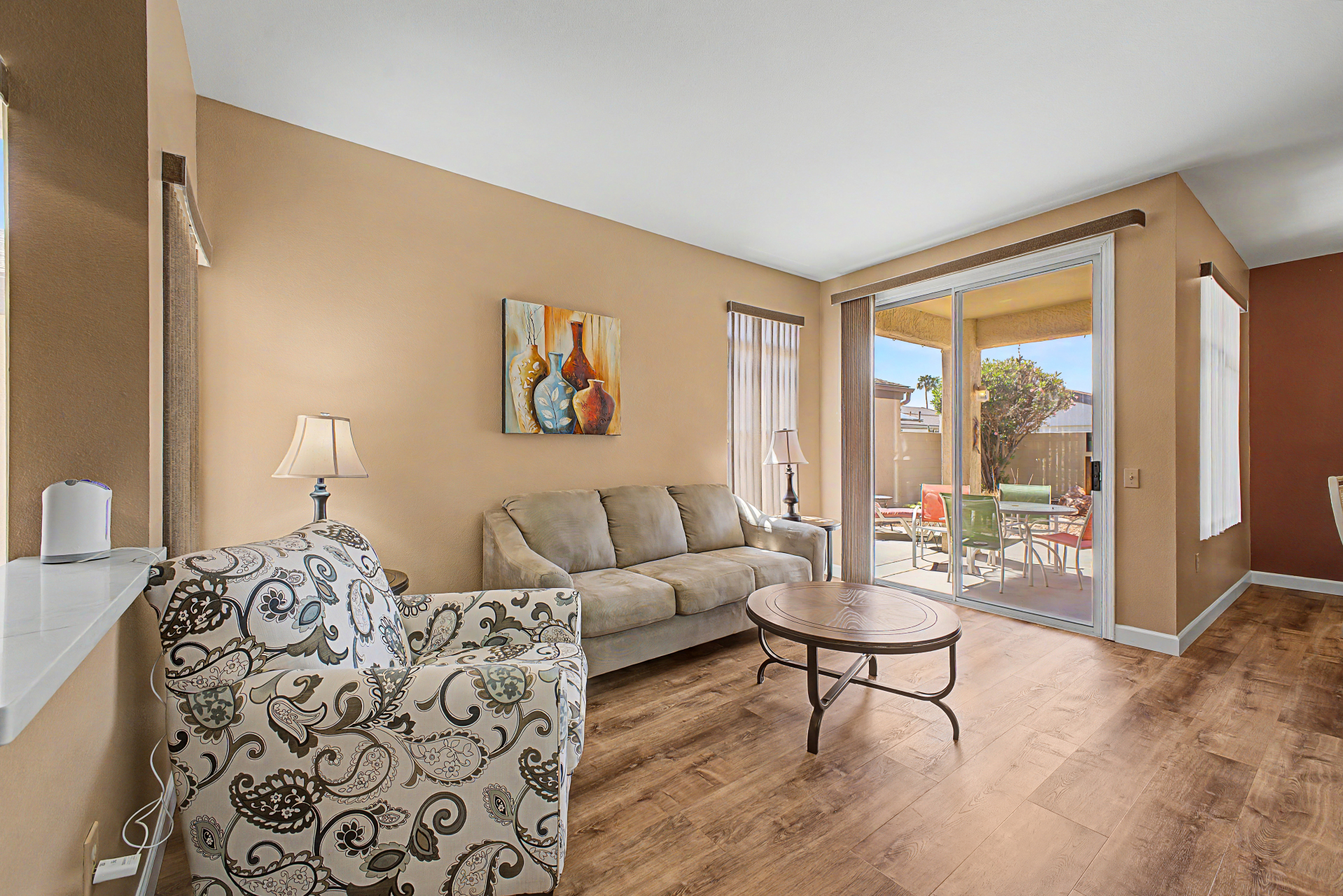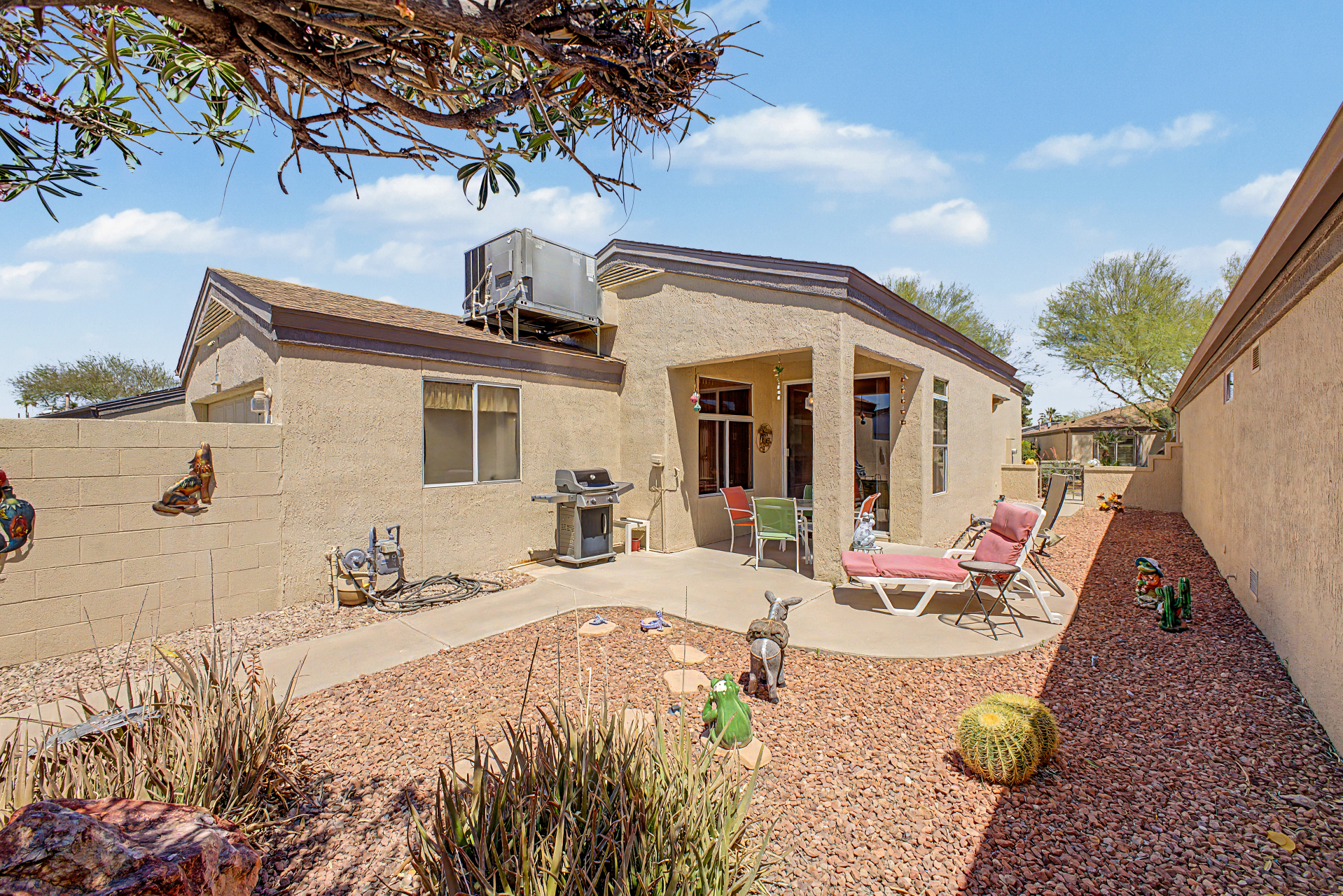 Welcome to this inviting Mojave model featuring a bright, open kitchen with white cabinetry, quartz countertops, stainless steel appliances, and a convenient breakfast bar overlooking the living area. The spacious primary suite offers plenty of room to relax, while the additional bedrooms provide flexibility for family, guests, or a home office. The home boasts updated bathrooms, including a generous guest bath with a large vanity and shower/tub combo. You'll also appreciate the inside laundry room and ample storage throughout, including a well-organized walk-in closet with shelving. Step outside to enjoy your private backyard oasis, complete with a covered patio and low-maintenance desert landscaping with mature plants, cacti, and colorful accents--perfect for entertaining.