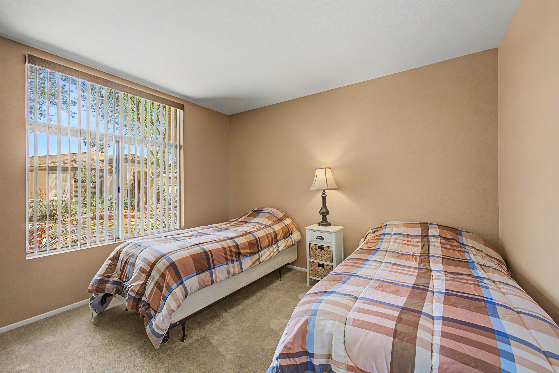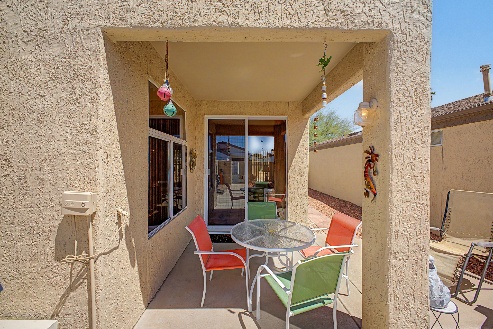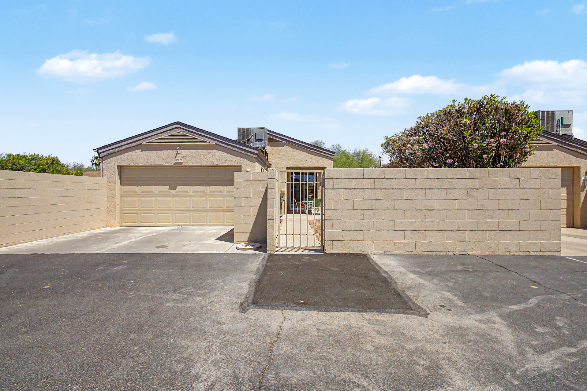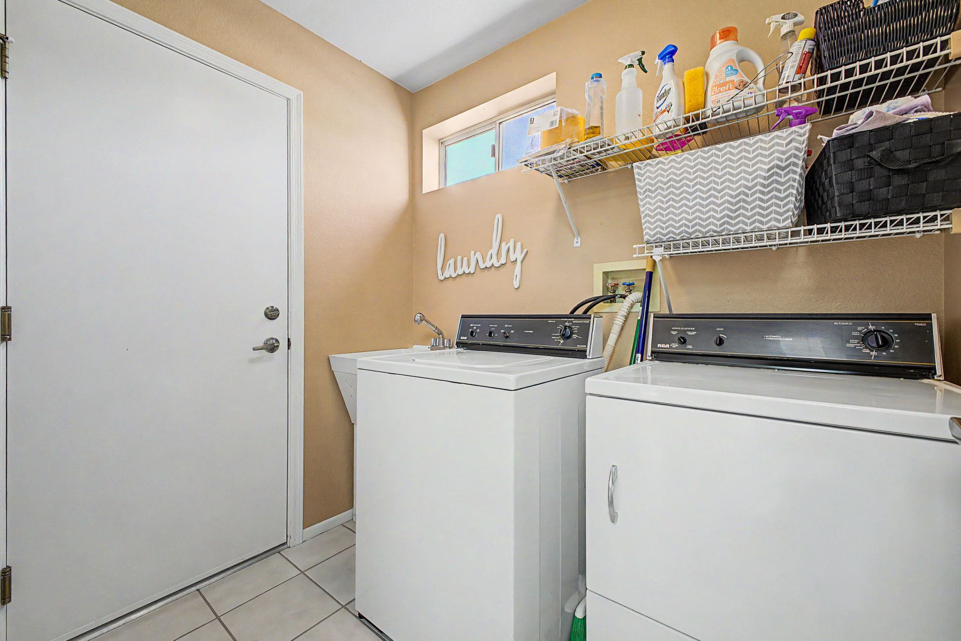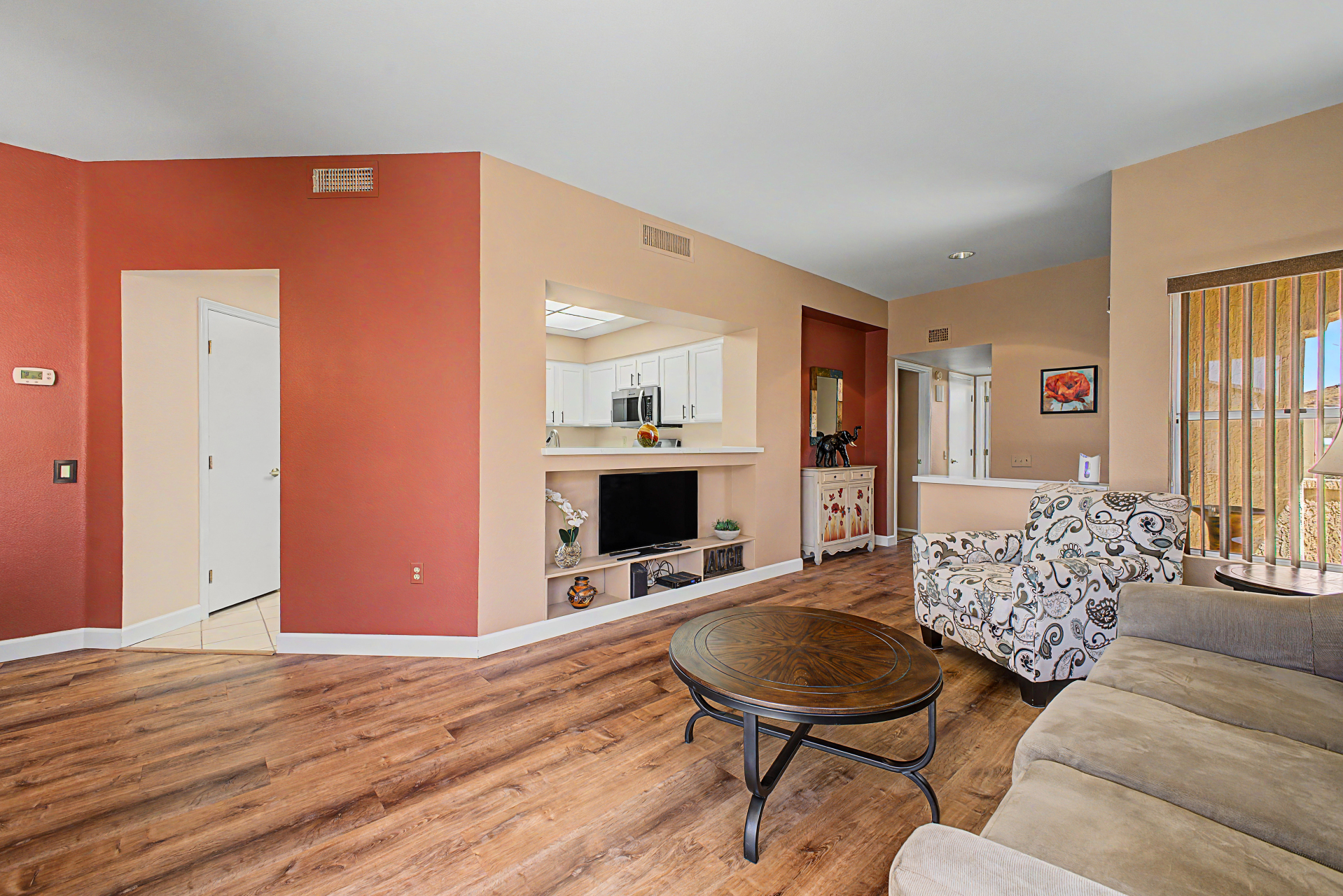 Welcome to this inviting Mojave model featuring a bright, open kitchen with white cabinetry, quartz countertops, stainless steel appliances, and a convenient breakfast bar overlooking the living area. The spacious primary suite offers plenty of room to relax, while the additional bedrooms provide flexibility for family, guests, or a home office. The home boasts updated bathrooms, including a generous guest bath with a large vanity and shower/tub combo. You'll also appreciate the inside laundry room and ample storage throughout, including a well-organized walk-in closet with shelving. Step outside to enjoy your private backyard oasis, complete with a covered patio and low-maintenance desert landscaping with mature plants, cacti, and colorful accents--perfect for entertaining.