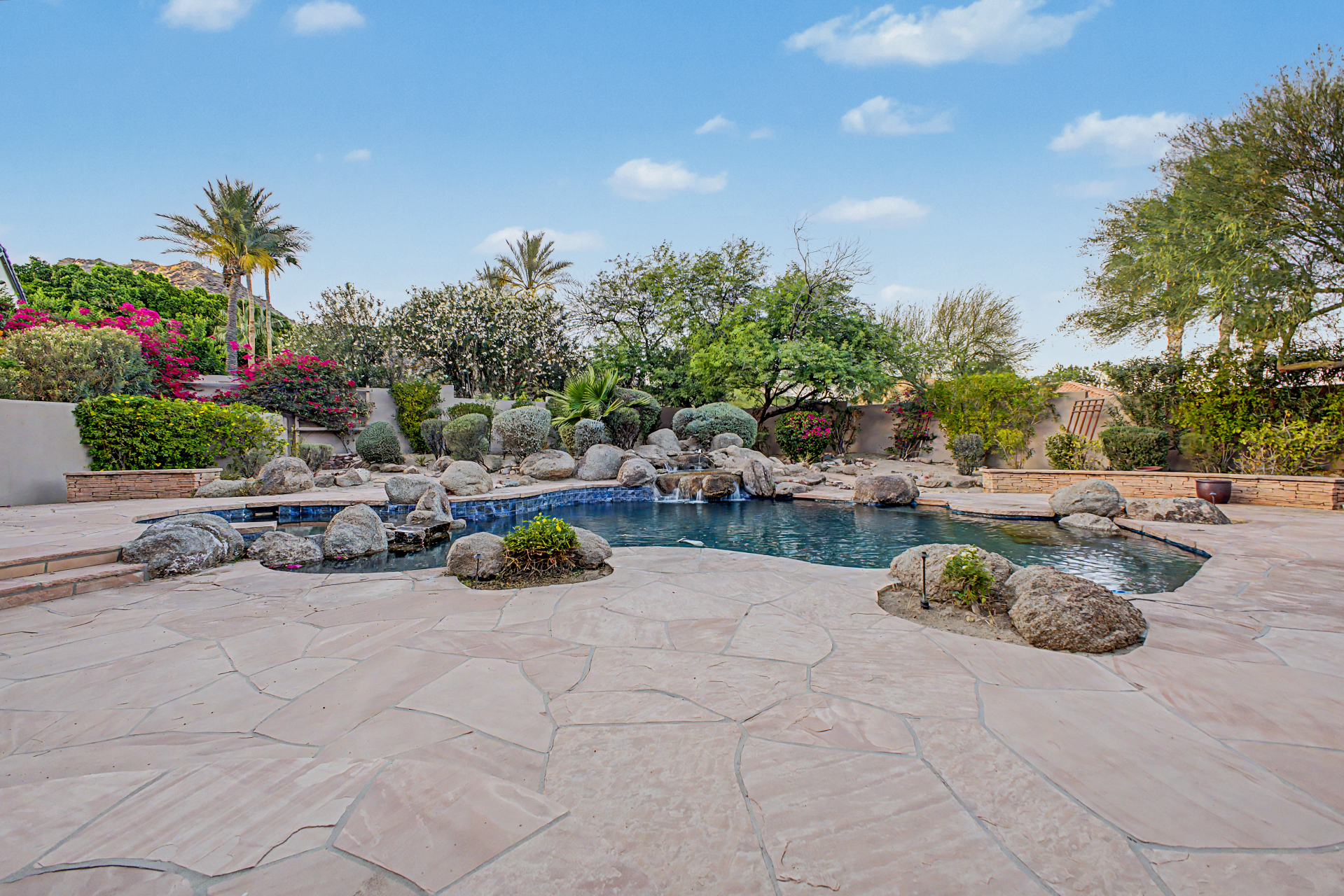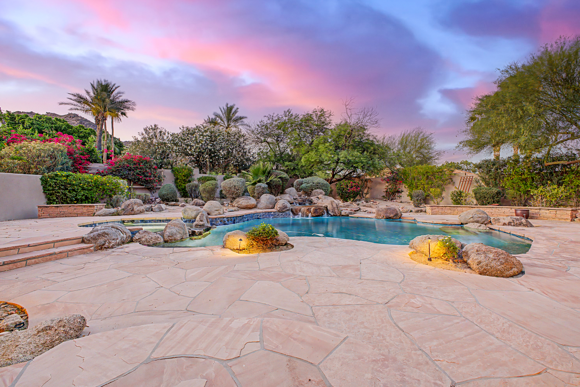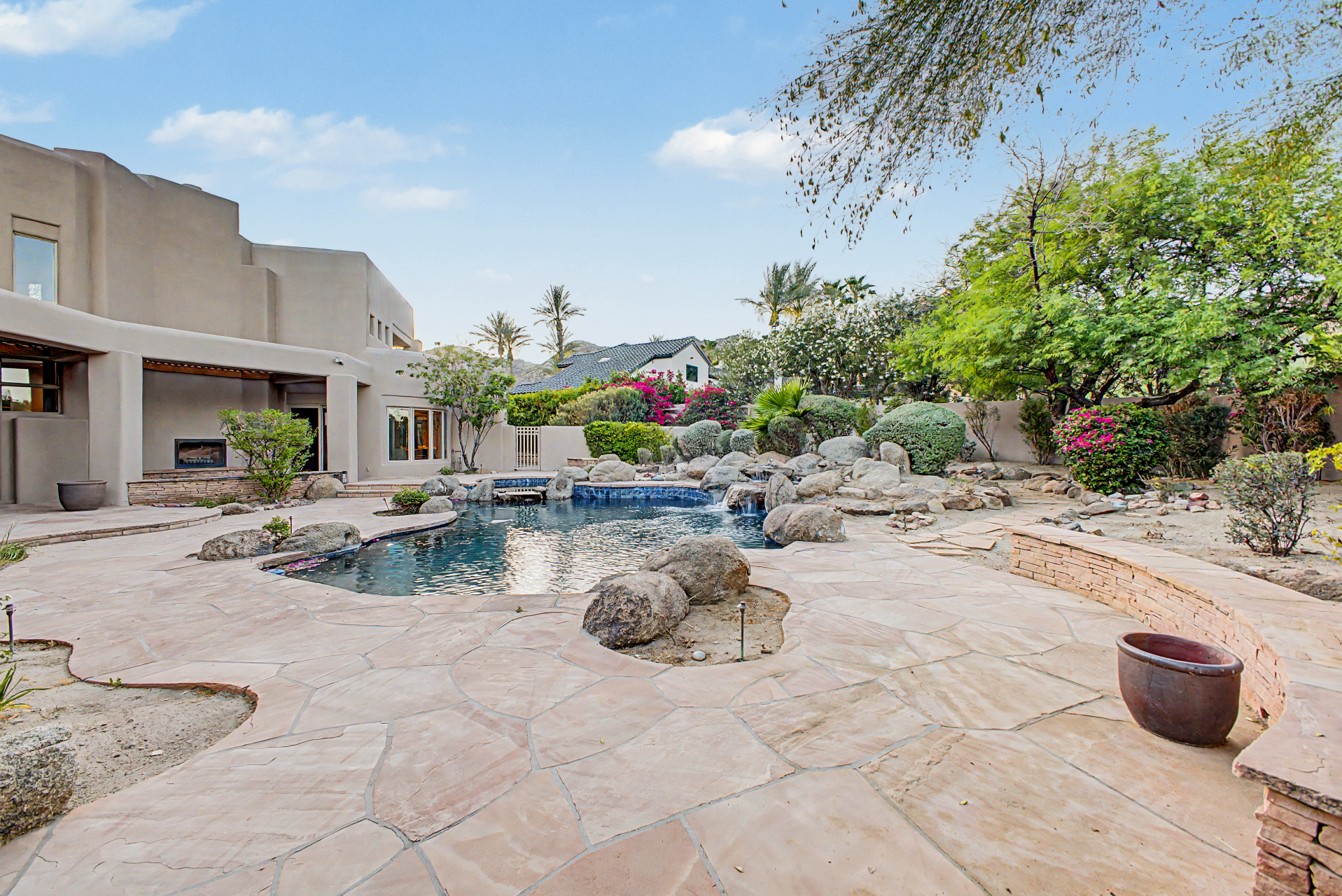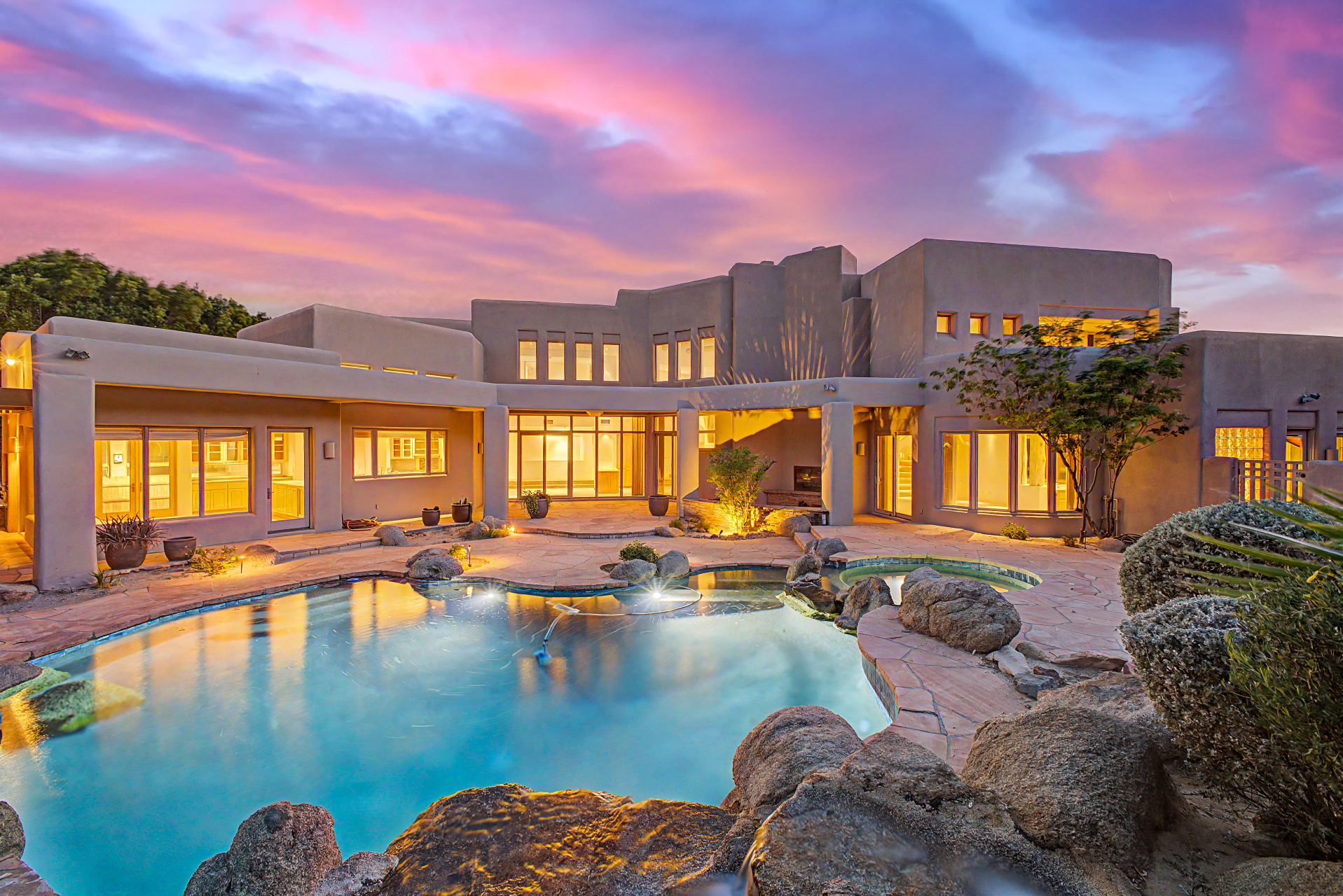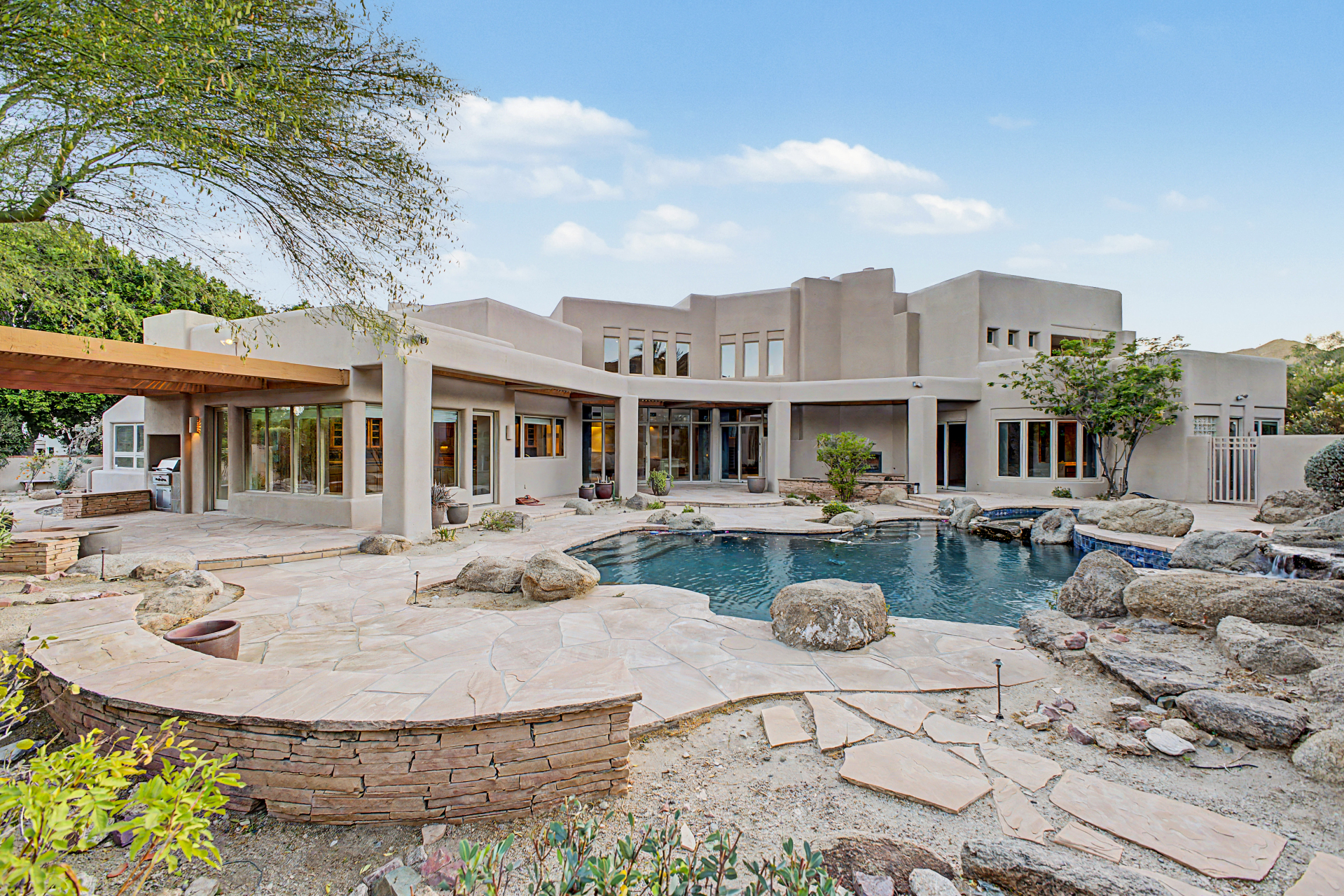 Ahwatukee Custom Estates finest and most private location on Montezuma Ct with amazing views!. This 6509 square foot home has 5 bedrooms, 3.5 bathrooms, pebble tech pool/spa, oversized 3 car garage and sits directly across from the South Mountain preserve and mountain trails. Large eat-in kitchen with 2 sinks, Sub Zero refrigerator, two wine refrigerators and large walk-in pantry. Primary bedroom is downstairs with large walk-in closet full of built-ins, its own entertainment loft with wet bar and balcony. Also, its own private patio and separate exit to resort backyard. Two more bedrooms downstairs and two upstairs. Don't forget to notice the different private patios and balcony's around the house. Tons of storage in the home and garage. Original owner who has architectural plans.