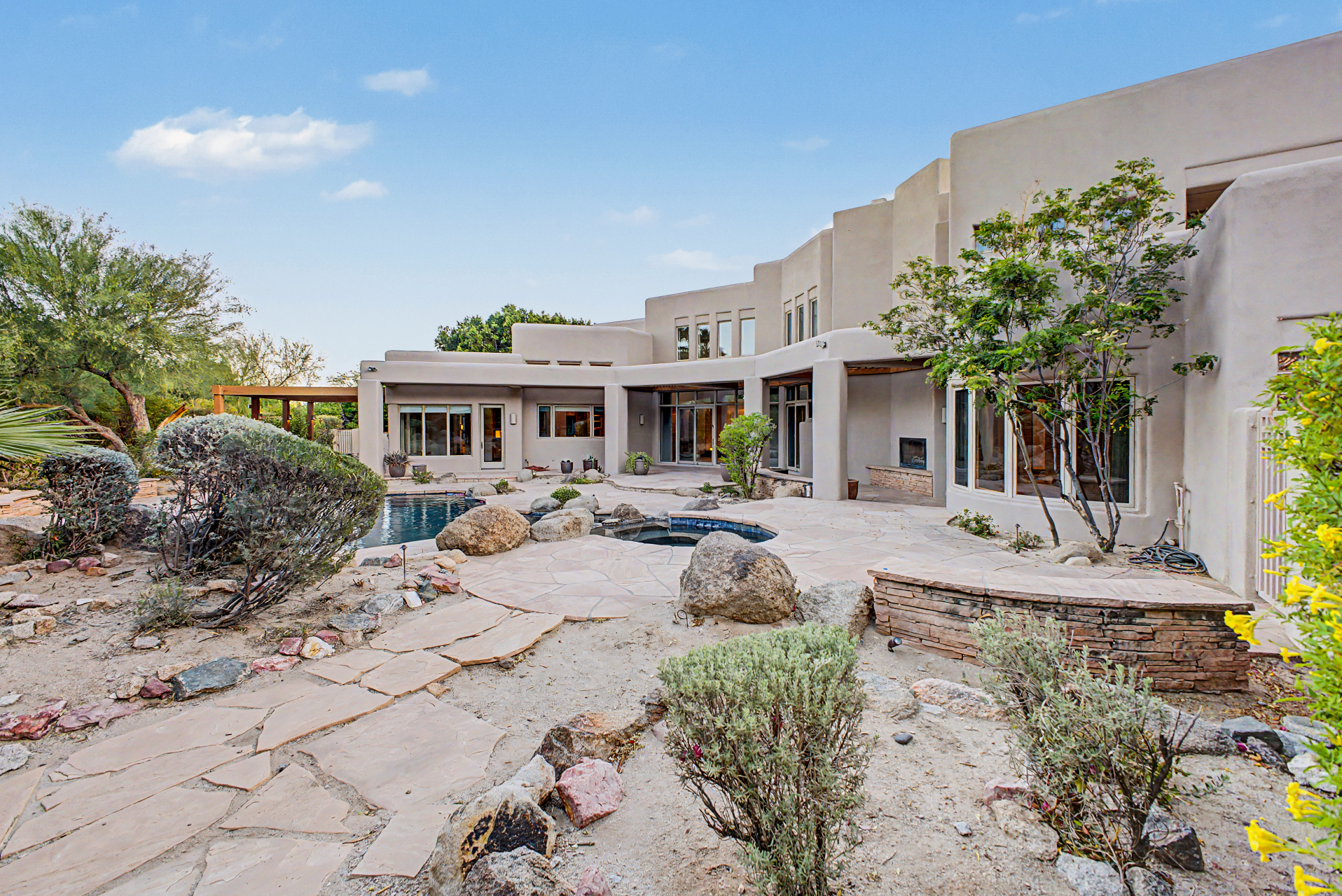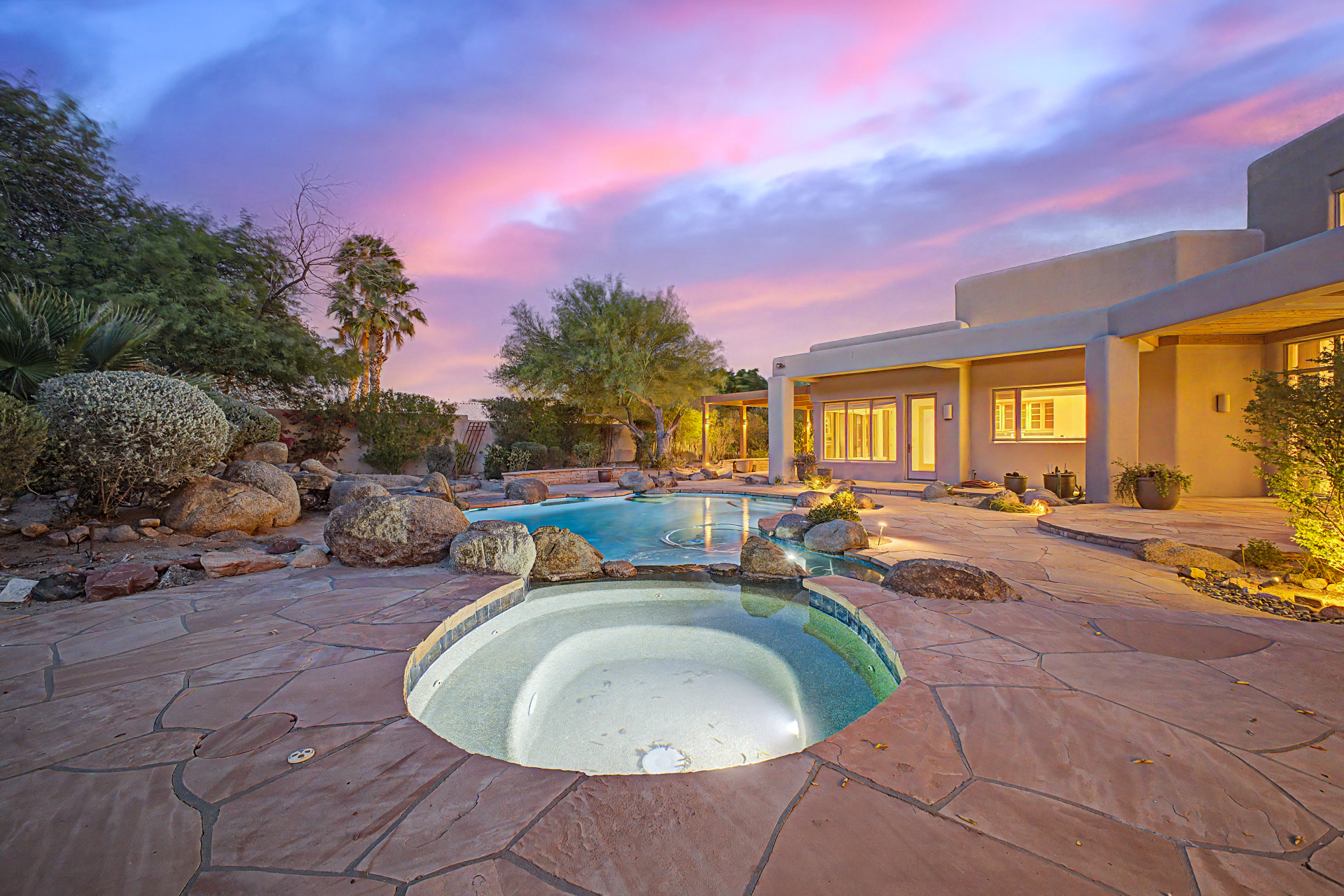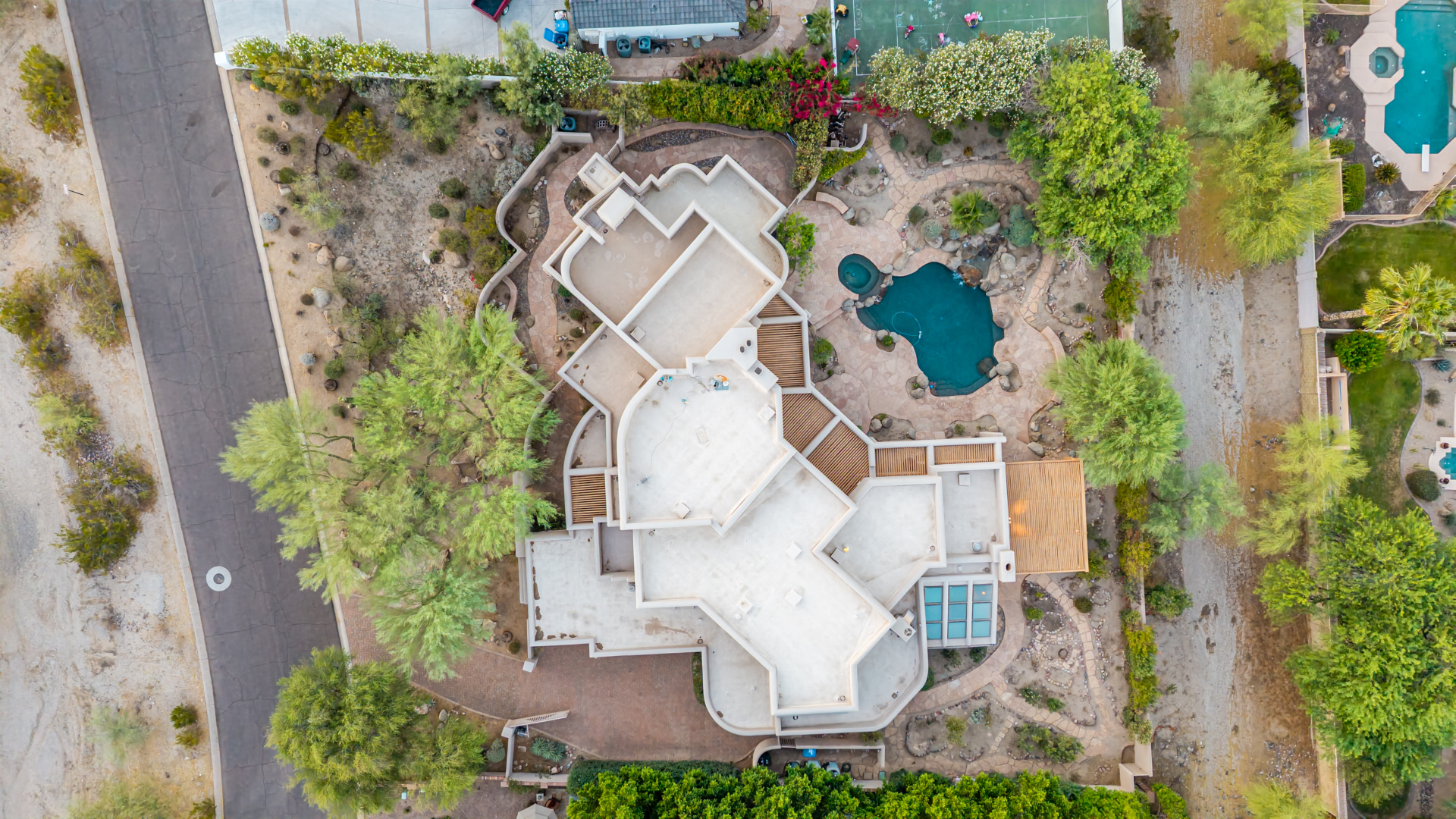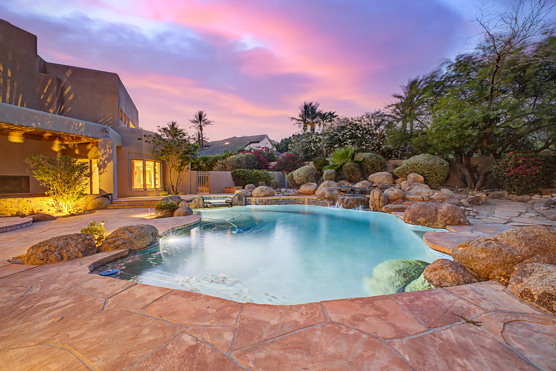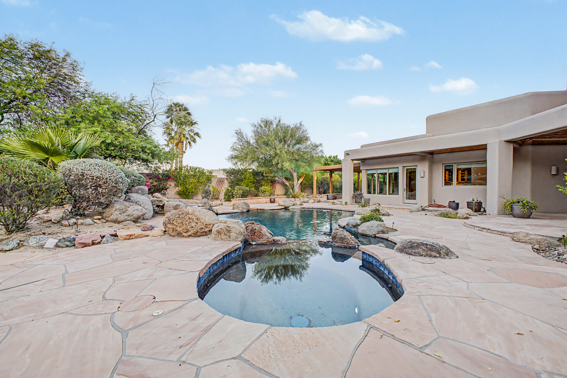 Ahwatukee Custom Estates finest and most private location on Montezuma Ct with amazing views!. This 6509 square foot home has 5 bedrooms, 3.5 bathrooms, pebble tech pool/spa, oversized 3 car garage and sits directly across from the South Mountain preserve and mountain trails. Large eat-in kitchen with 2 sinks, Sub Zero refrigerator, two wine refrigerators and large walk-in pantry. Primary bedroom is downstairs with large walk-in closet full of built-ins, its own entertainment loft with wet bar and balcony. Also, its own private patio and separate exit to resort backyard. Two more bedrooms downstairs and two upstairs. Don't forget to notice the different private patios and balcony's around the house. Tons of storage in the home and garage. Original owner who has architectural plans.