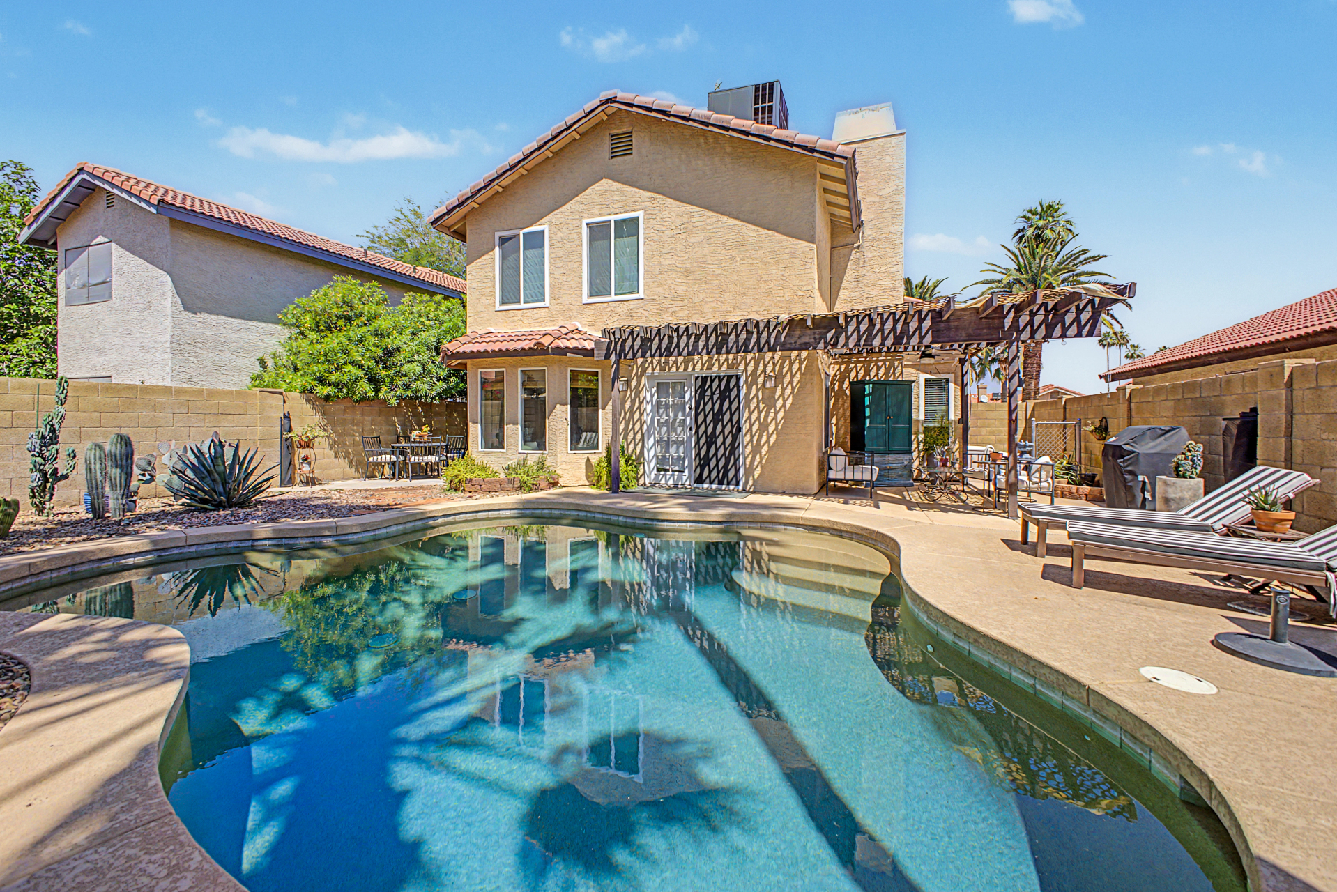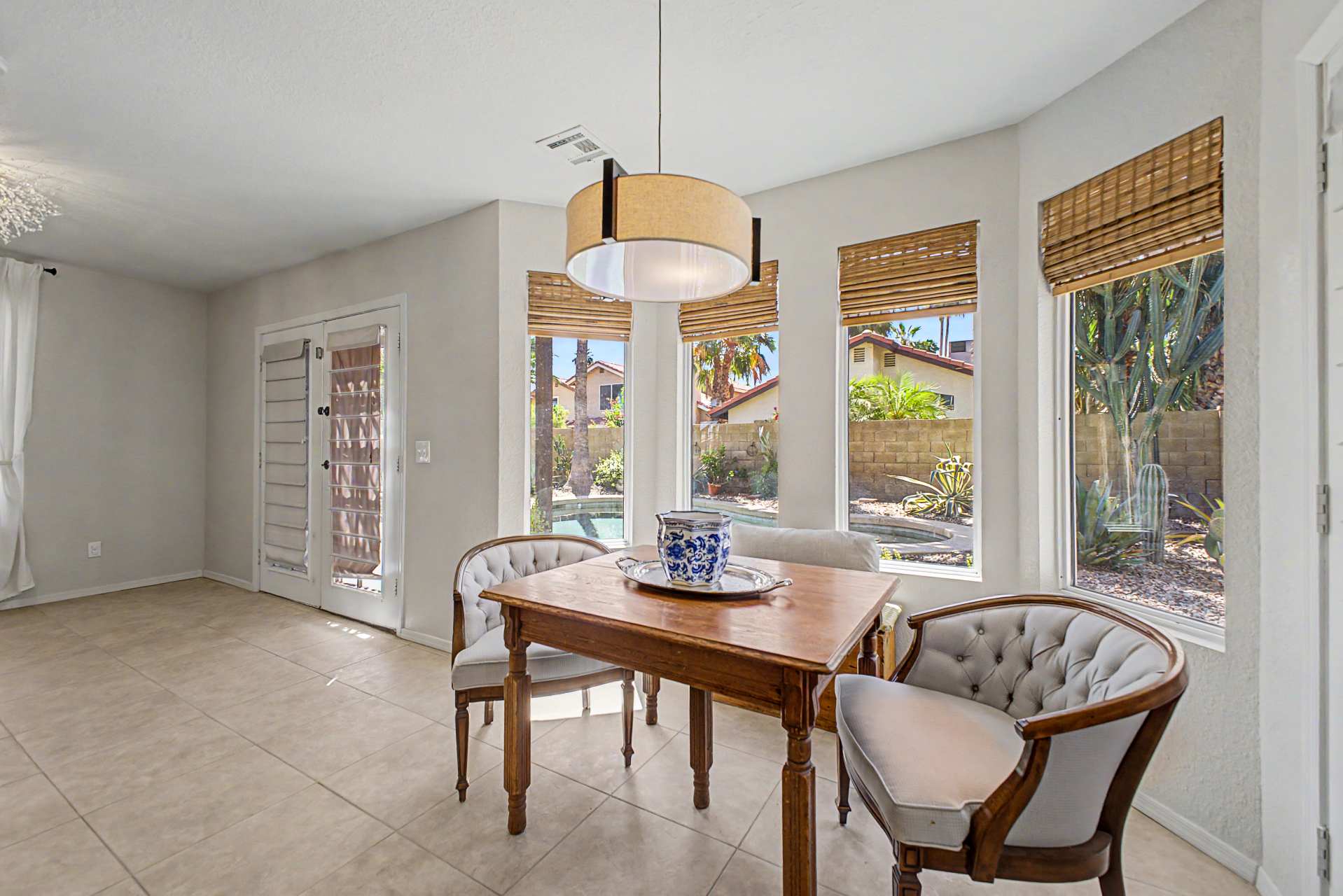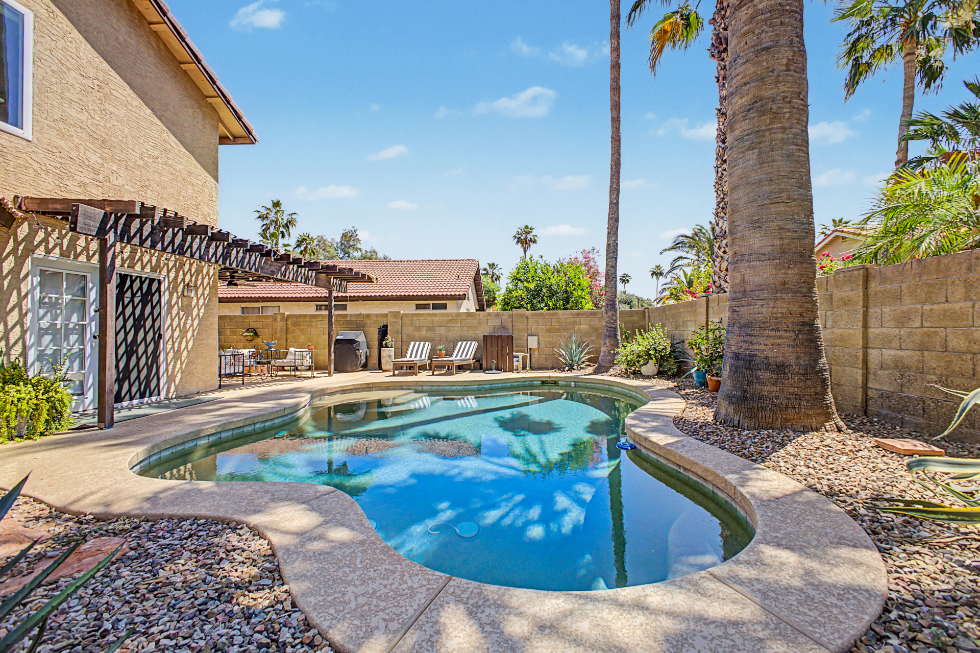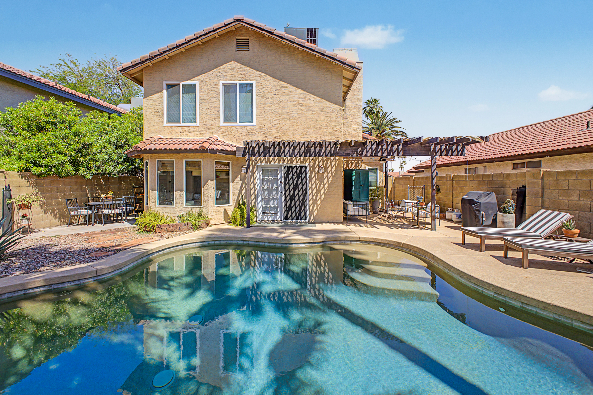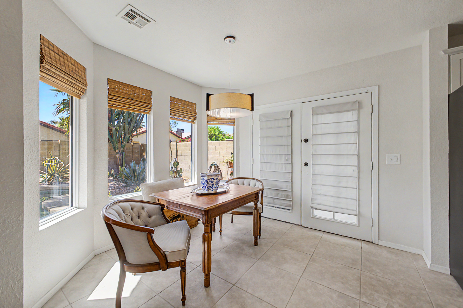 Wow! Come and see this beautifully remodeled home in an amazing location! This 3 bed/2.5 bath with a pool includes a nice remodeled eat-in kitchen with island, white cabinets, quartz counters, built-in micro, pantry and SS appliances. French doors lead to resort backyard with pebble tech diving pool. All bathrooms have been remodeled with tile showers, fixtures and soft close toilets. Don't miss the over sized primary bedroom and walk in closet! Other updates include light fixtures/dimmers, tile floors, new HVAC installed in 2023, new hot water heater 2024, new dishwasher 2023, new microwave 2026. Most windows replaced in the recent past. HOA takes care of the front yard! Community pool, parks and pickle ball! Close to all freeways, Mall and excellent schools. To show is to sell!