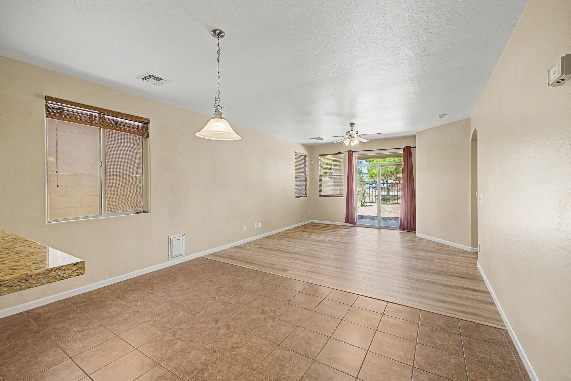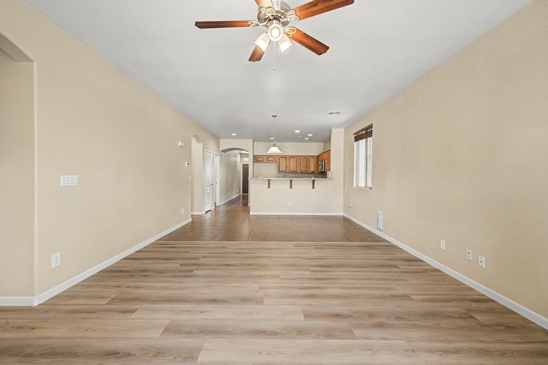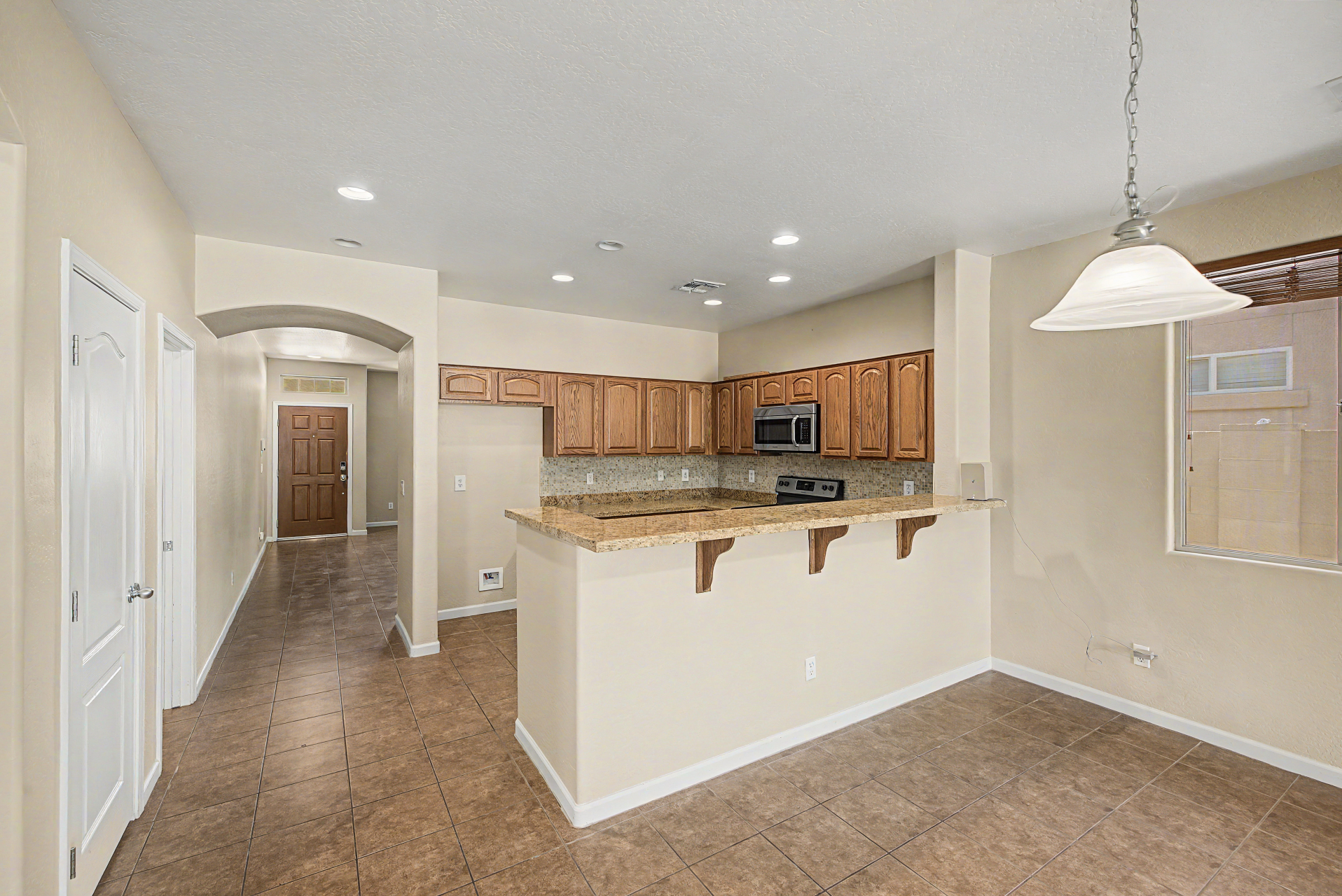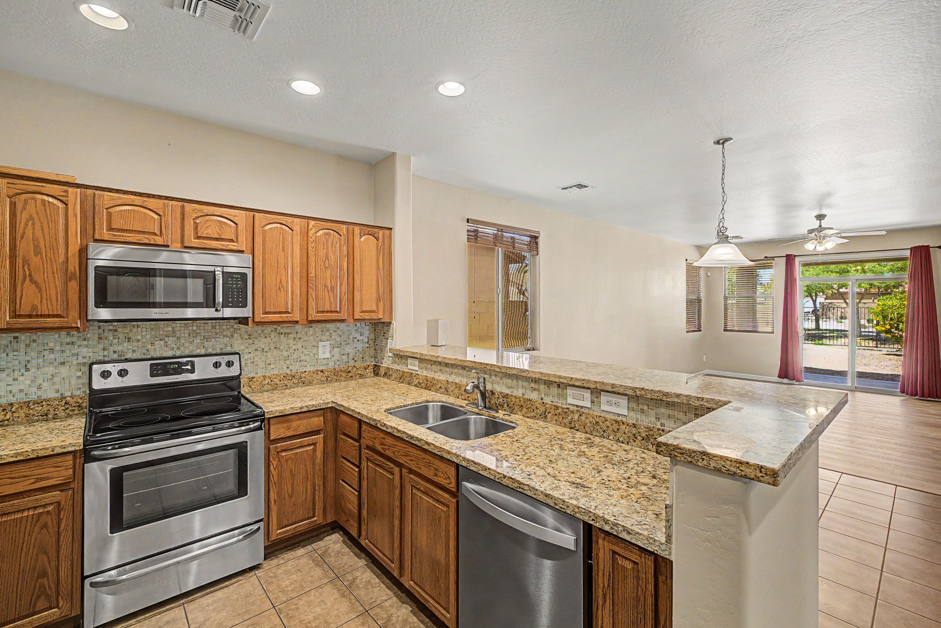 Beautifully situated on a premium corner lot, this home offers added privacy with a single-story property on the left and a greenbelt on the right. Enjoy serene outdoor living from the back patio overlooking a view fence and lush park setting. Inside, you'll find a bright and open layout featuring picture windows that bring in abundant natural light. The kitchen is well-appointed with stainless steel appliances, upgraded granite countertops, attractive cabinetry, a breakfast bar, and a pantry--perfect for both everyday living and entertaining. The home features ceramic tile flooring in the main living areas, along with recently updated laminate flooring (installed 4/2/2026) in the bedrooms and hallway. The desirable split floor plan offers privacy, with the primary suite and one secondary bedroom on one side of the home, and two additional bedrooms on the opposite side connected by a convenient Jack & Jill bathroom.
