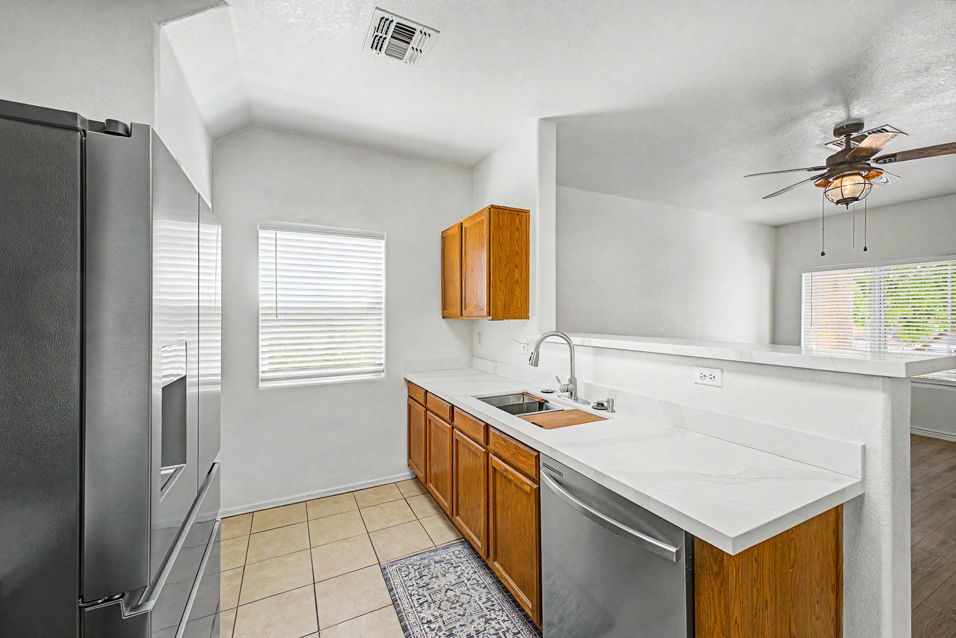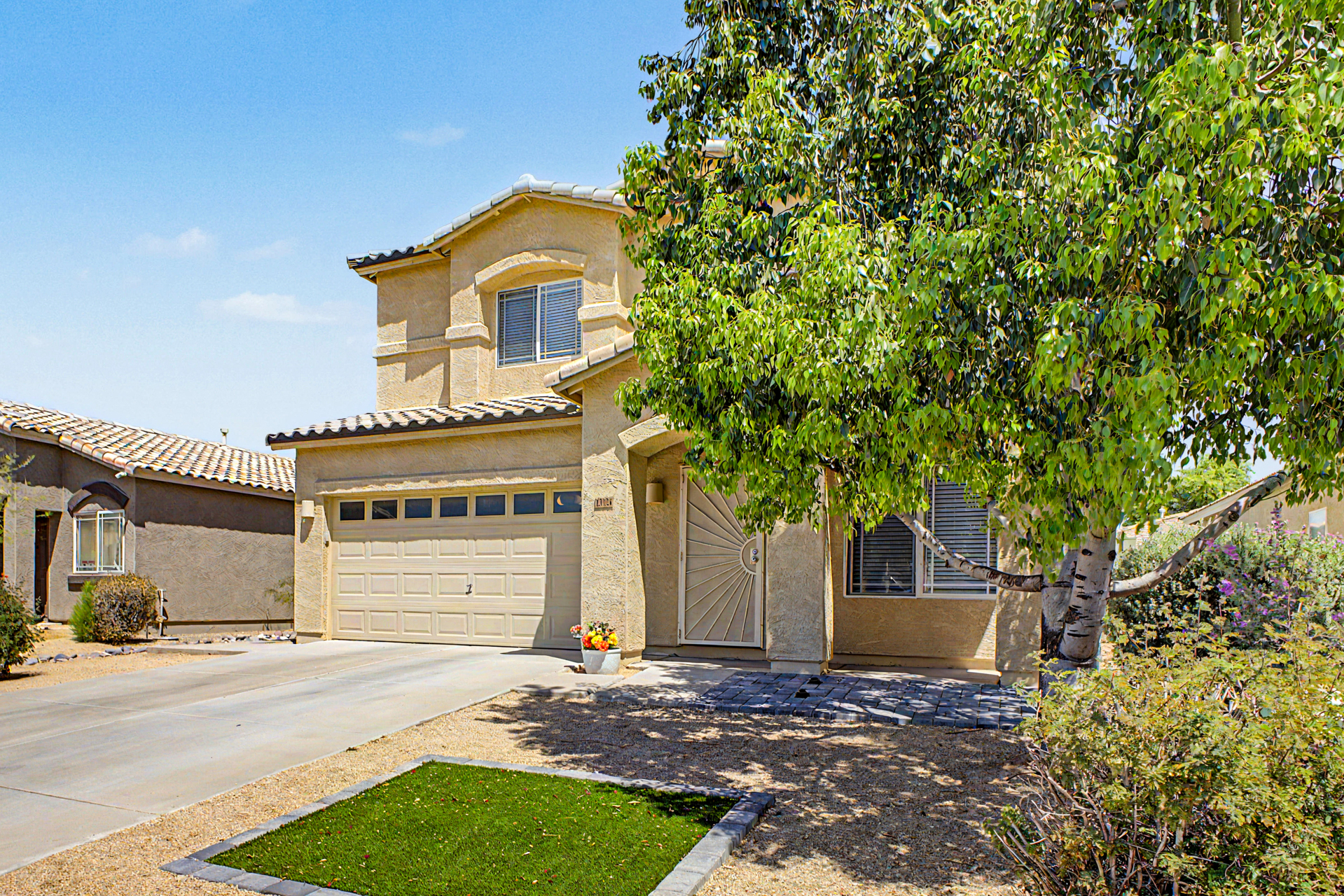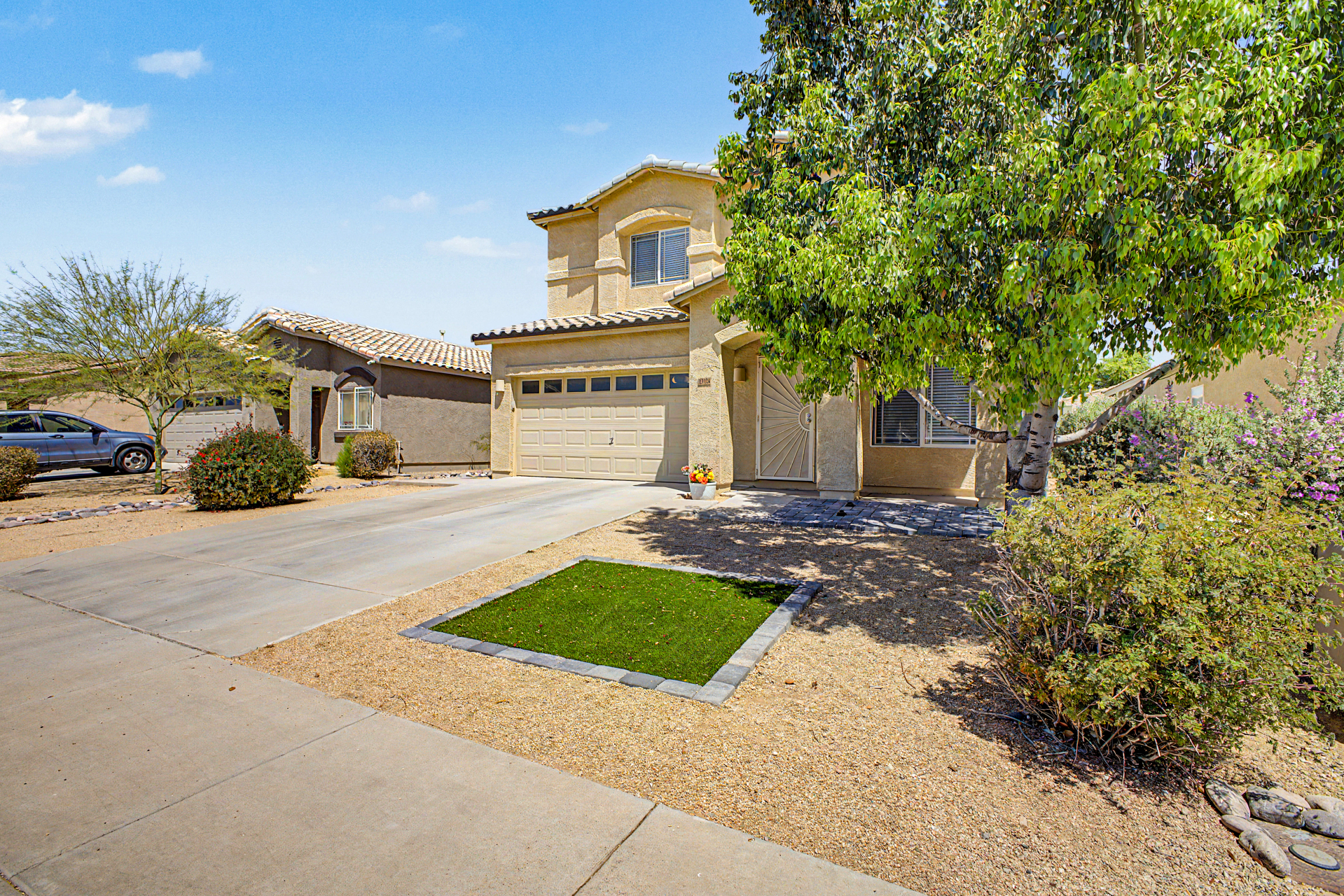 Must see this lovely updated two story home featuring 3 bedrooms, 2 1/2 baths, 2 car garage with brand new carpet and laminate flooring. Beautiful quartz countertops in kitchen & all bathrooms. Open concept living room with 9' flat ceilings throughout. New kitchen appliances include refrigerator, dishwasher, stove, deep stainless steel sink and new water heater. New 2'' faux window blinds throughout. Attractive street appeal with front sidewalk. Large private backyard with open patio & combination grass and rock landscaping. Laundry area includes washer/dryer and half bath downstairs. Desirable location to schools, various shopping, restaurants and sports venues. The city of Surprise is a vibrant and socially active community and a great place to live. This home is move-In ready!